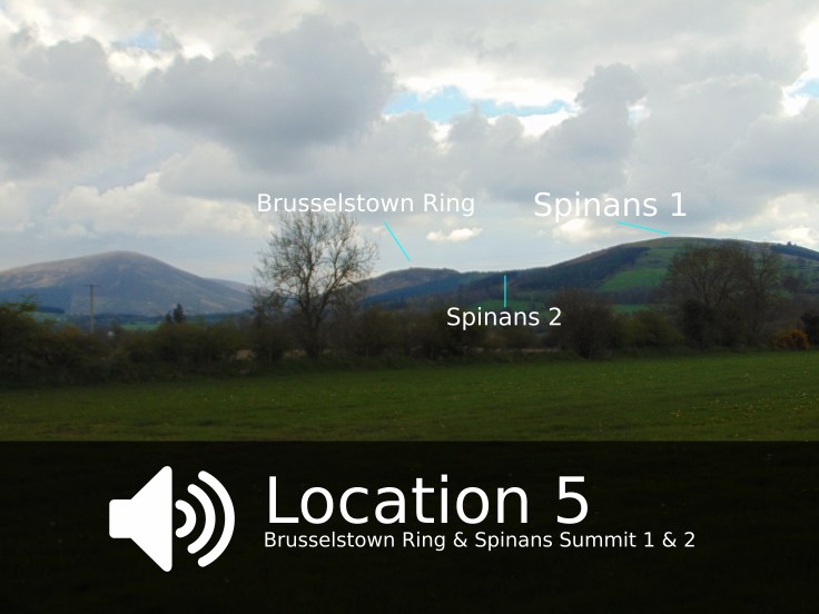 | Viewpoint | The view as pictured in the above image is best observed as you cross the wooden style, entering the field where the stone circle is. This is Spinans summit 1 to the forefront, Brusselstown is the nodulated hilltop connected at the back to Spinans summit 1. And Spinans 2 is the brow in between. Lugnaquilla is to the left of your gaze. Once you have orientated yourself to the hill tops, we recommend you proceed to the stone circle to listen to the audio recording. |